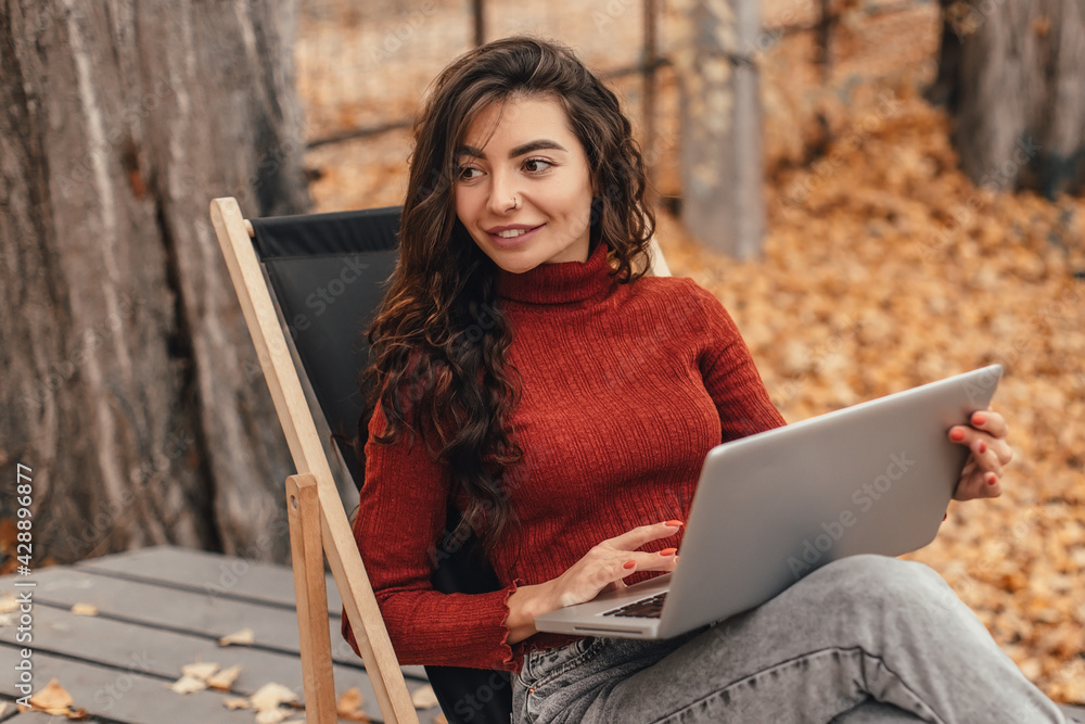 Beautiful woman in cozy outfit works at laptop while sitting on chair in autumn park.