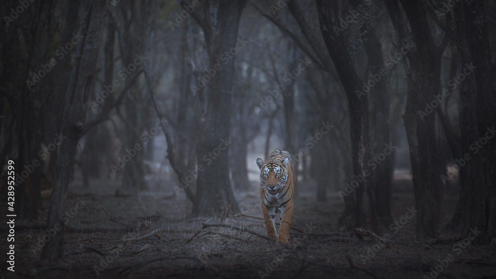 Amazing tiger in the nature habitat. Tiger pose during the magical light. Wildlife scene with danger animal. Hot summer in India. Dry area with beautiful indian tiger. Panthera tigris.