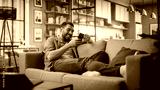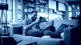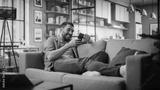 Happy Handsome Caucasian Man Using Smartphone in Cozy Living Room at Home. Man Resting on Comfortable Sofa. He's Browsing the Internet and Checking Videos on Social Networks and Having Fun.
