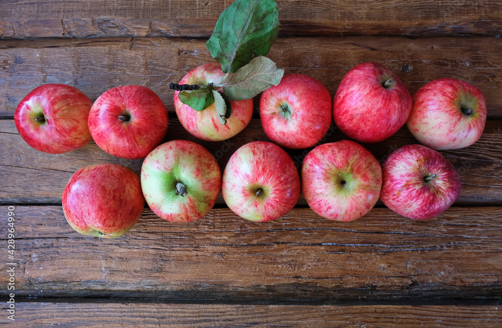 Fresh red-pink striped apples on a wooden brown background. Background with fresh fruit. The view from the top.