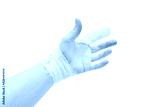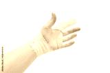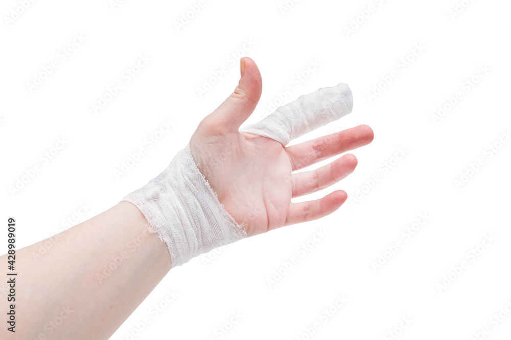 White-skinned hand with bandaged index finger and wrist, isolated on white background.