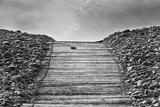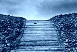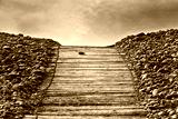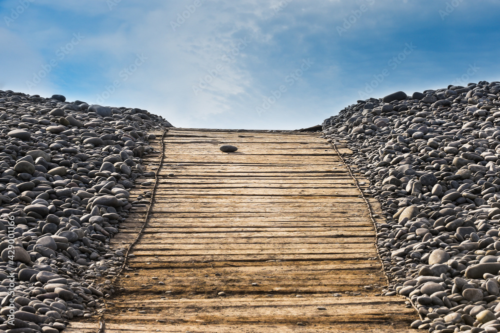 Boardwalk pathway to a sandy beach in summer with blue sky