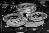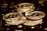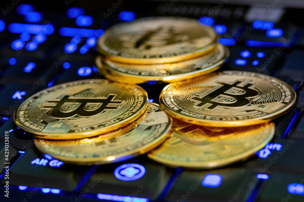Bitcoin, new Virtual money concept. Gold bitcoins with blue lighting computer keyboard background. Golden coin with icon letter B. Mining or blockchain technology