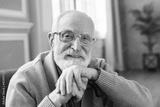 Close up photo of grey haired grandparent with walking stick head lean on hand wearing casual outfit sitting on cozy sofa. Physically disabled positive old grandfather seated on couch resting at home.