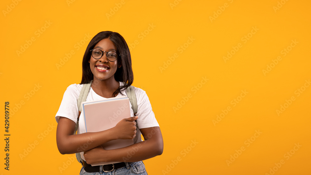 Positive african american woman student with notebook on yellow