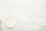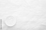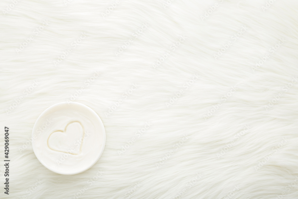 Heart shape drawn in cream. White jar on light fur blanket background. Care about face, hands, legs and body skin. Closeup. Empty place for text or logo. Top down view.