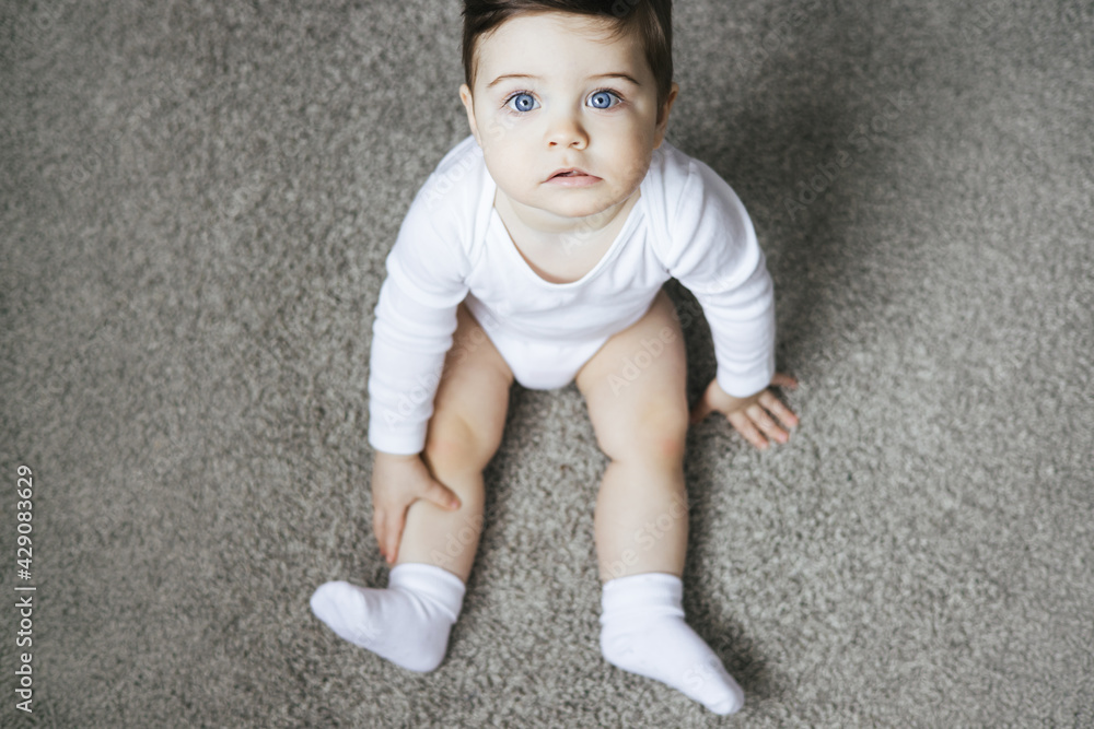 Infant child baby toddler kid in white bodysuit sitting on carpet and looking at the camera