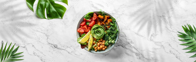 Buddha bowl salad with baked sweet potatoes, chickpeas, tomatoes, greens, avocado on white marble background with tropical leaves. Healthy food, clean eating, Buddha bowl salad, detox, top view