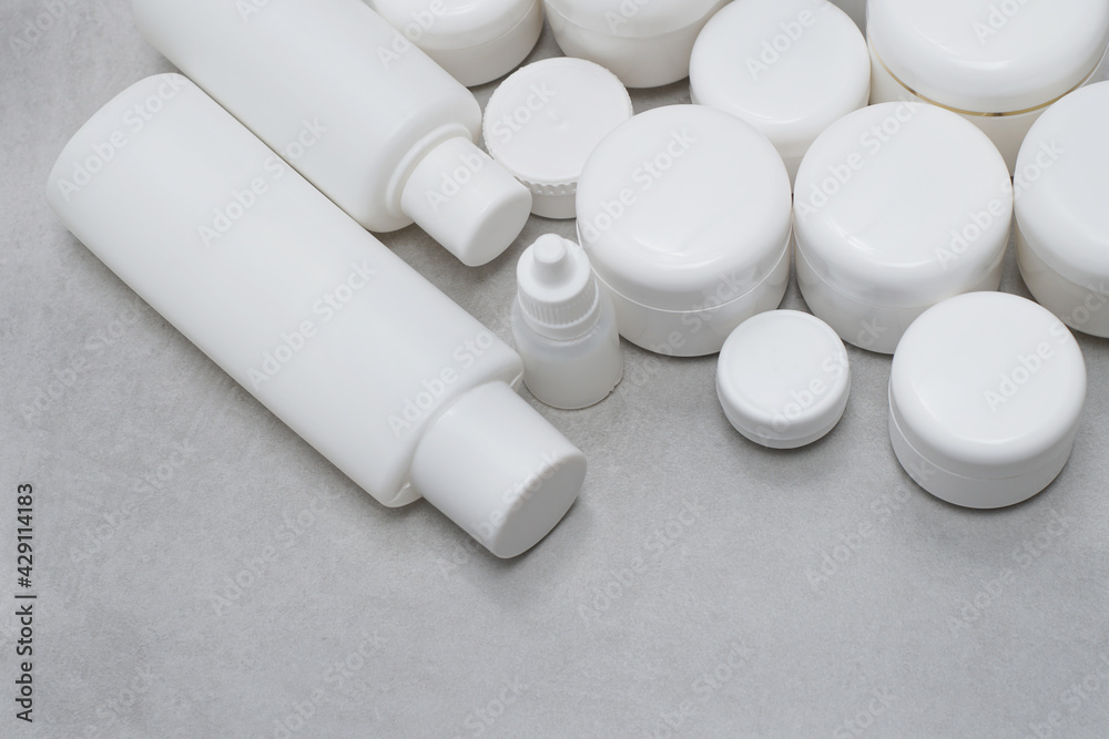 Mock-up..Empty bottles and jars for gel, lotion, cream..White plastic containers for skincare products without labels..Unbranded beauty product package..Cosmetic or pharmacy concept