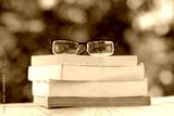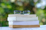 Education learning concept with open book or textbook in library, stack piles of book on table and space