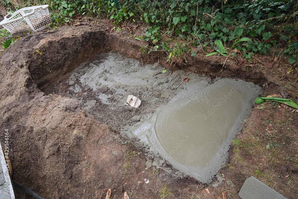 A trench under the foundation filled with concrete made in the garden of a rural house