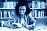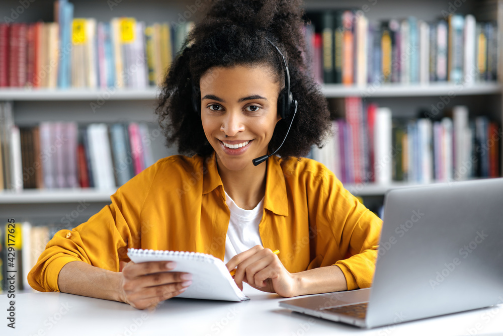 Female African American student with a headset, sitting at a table in the library, holding a notebook in her hand, using a laptop for distance learning, looking at the camera, smiling