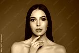 Beautiful young woman with evening makeup on brown background. Eye shadow product