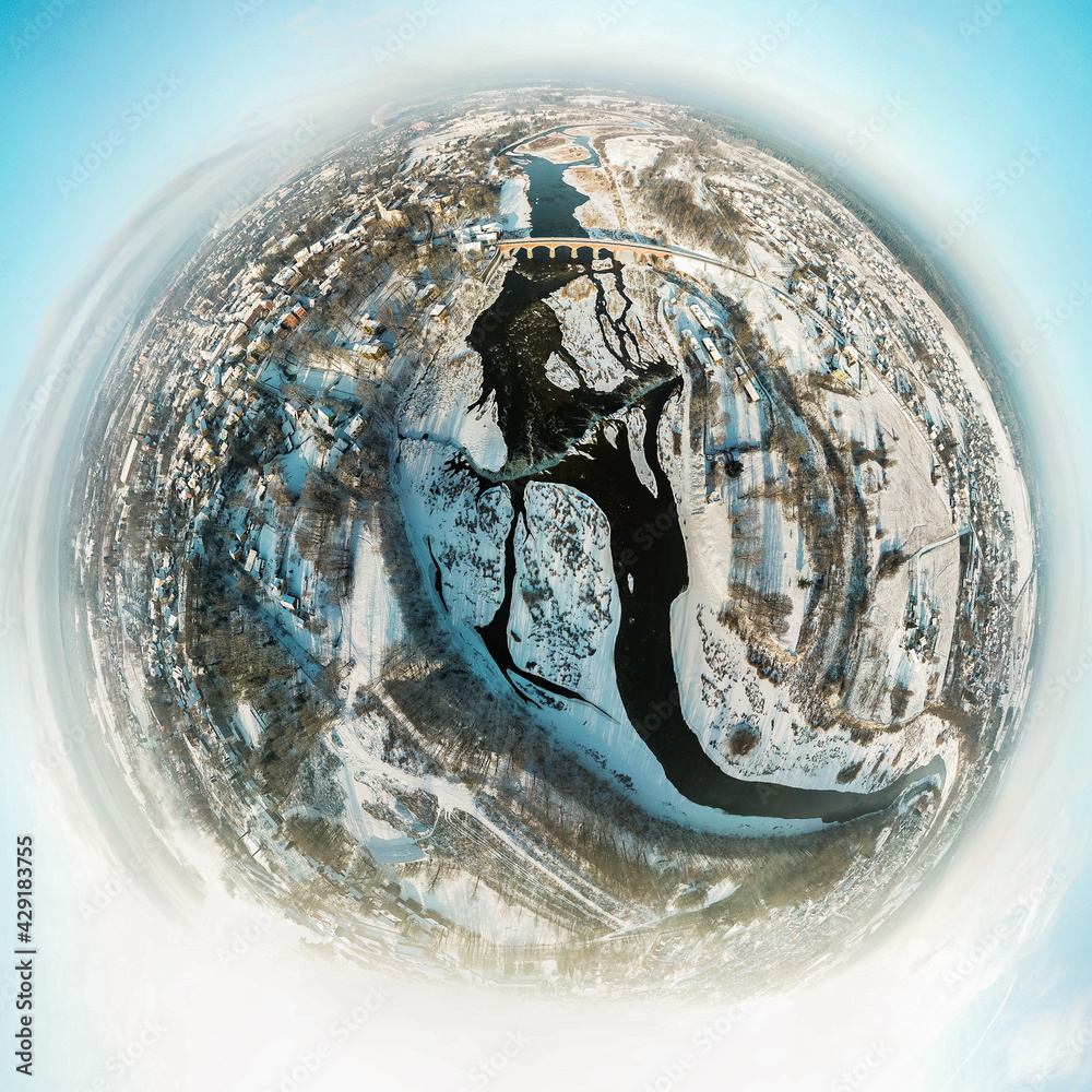 Beautiful little planet with Kuldiga town and bridge in winter, Latvia.