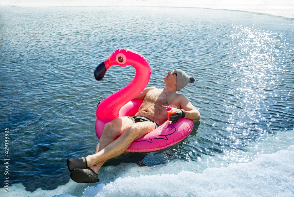 A man swimming in an ice hole in winter in Finland, floating on a pink inflatable flamingo with cocktail in hand. Vacation options, dreaming of summer.