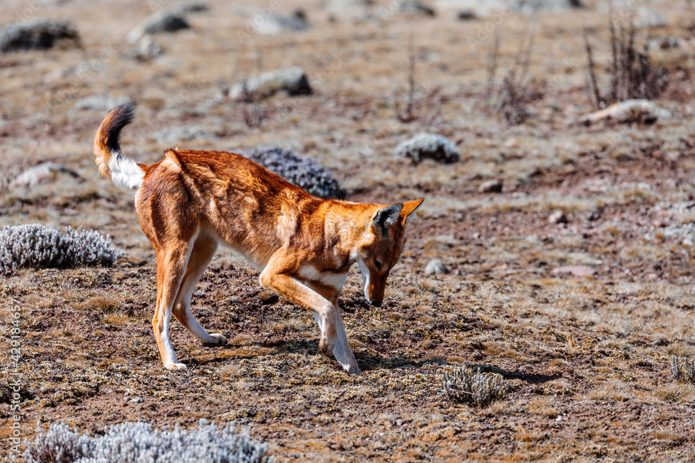 very rare endemic ethiopian wolf, Canis simensis, Sanetti Plateau in Bale mountains, Wolf hunting Big-headed African mole-rat. Africa Ethiopian wildlife. Only about 440 wolfs survived in Ethiopia