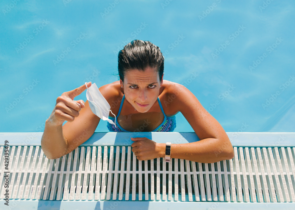 Young upset woman showing face mask against Covid 19 during summer vacation under pandemic.