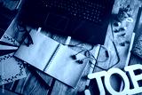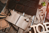 Recycable stationary and office eco friendly, plastic free supplies, home office desktop organisation, work from home, online business idea. Flat lay, top view