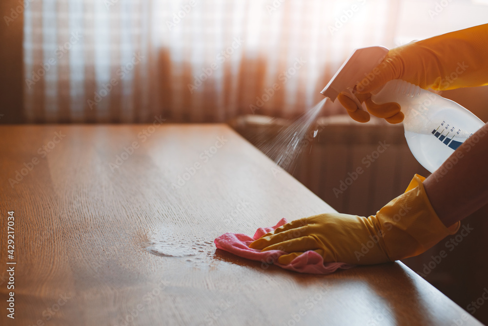 cleaning and maintenance of wooden furniture chair table with rag and cleaning agent