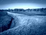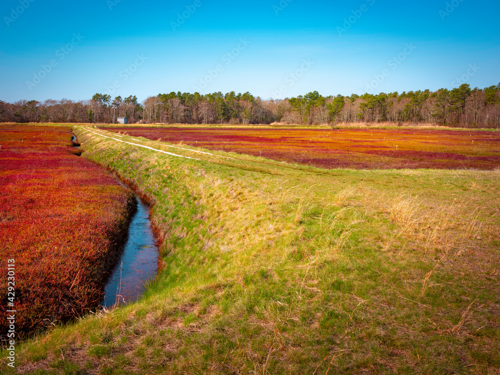Tranquil cranberry bog with green riverbank and water irrigation channel