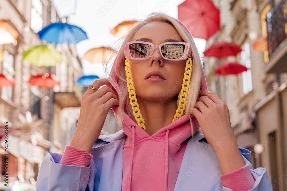 Fashionable confident girl wearing trendy pink sunglasses with yellow plastic chain, hood, blue trench coat, posing in European city. Streetstyle, street fashion conception. Close up portrait