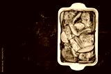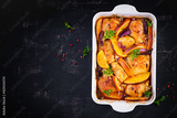 Baked chicken thighs. Appetizing slices of baked chicken with red onion and oranges in a baking dish. Top view, copy space