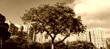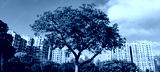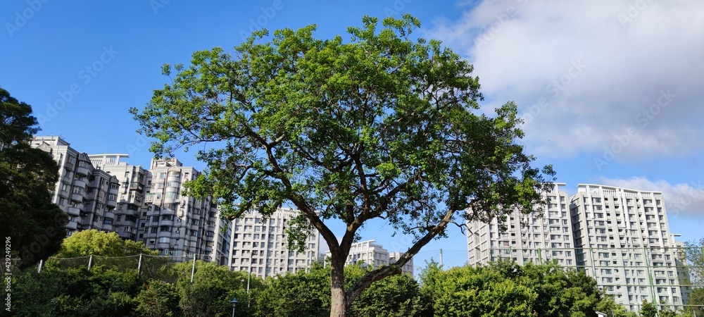 green tree on a meadow, with clear blue sky in the background, panorama format