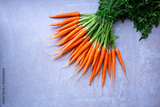 Bunch of farm fresh carrots with green leaves. Healthy organic vegetables on grey background. Fresh harvest from the market. Flat lay backdrop in top view.