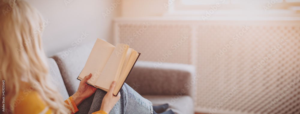 Young woman on the couch reading an interesting book.