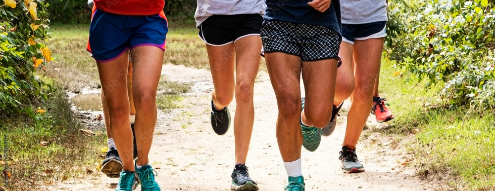 Front view of teenage girls running in a group on a dirt path
