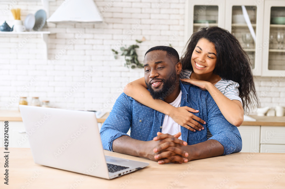 Biracial woman hugging man from behind, mixed ethnicity couple relax in new apartment at home browsing internet on laptop, show love everyday in the simplest of ways, watching video, looking at screen