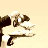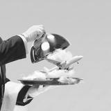 Contemporary art collage, modern design. Summer mood. Waiter serving air vacation with plane on yellow