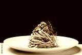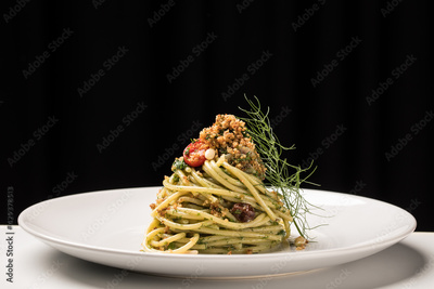 Pilchard Pasta from Italy – Traditional Sicilian Gourmet Dish with Fresh "Sarde" Fish ("Sardine") and Fennel Leaves, Bread Crumbs, Tomato, Pine Nuts, Raisins – White Plate on Black Background