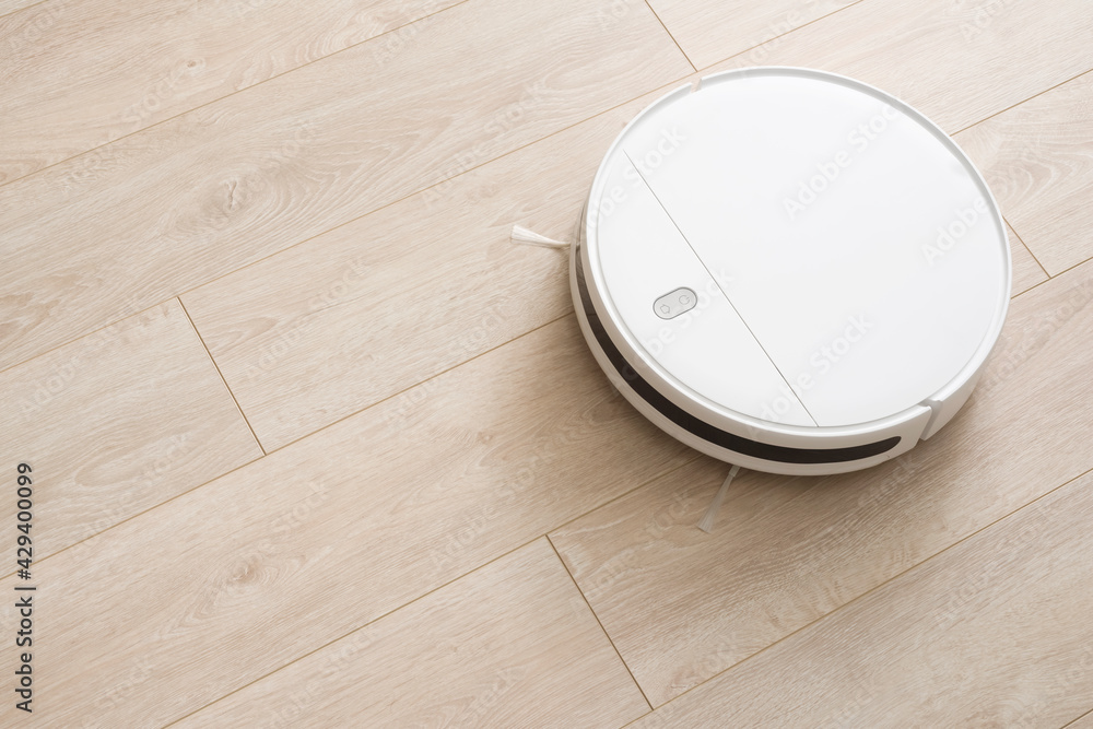 Close-up of robotic vacuum cleaner on wooden texture laminate floor