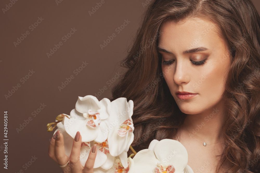 Healthy young model woman with perfect skin, brown curly hair and white orchid flowers. Facial treatment and skin care concept