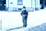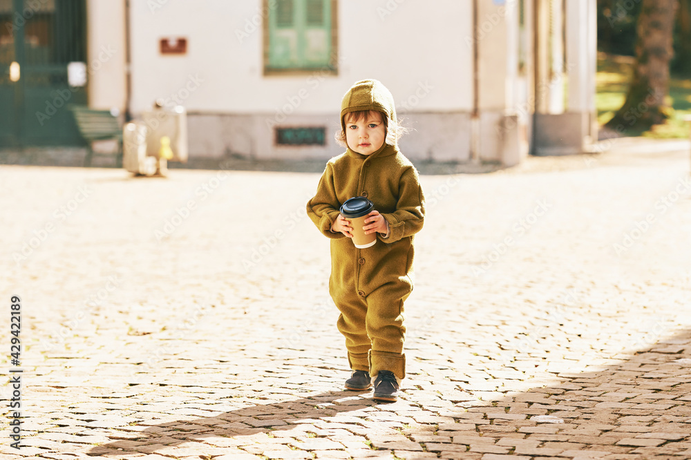 Outdoor portrait of adorable toddler kid walking down the street, wearing olive color warm jumpsuit, holding takeaway cup of coffee