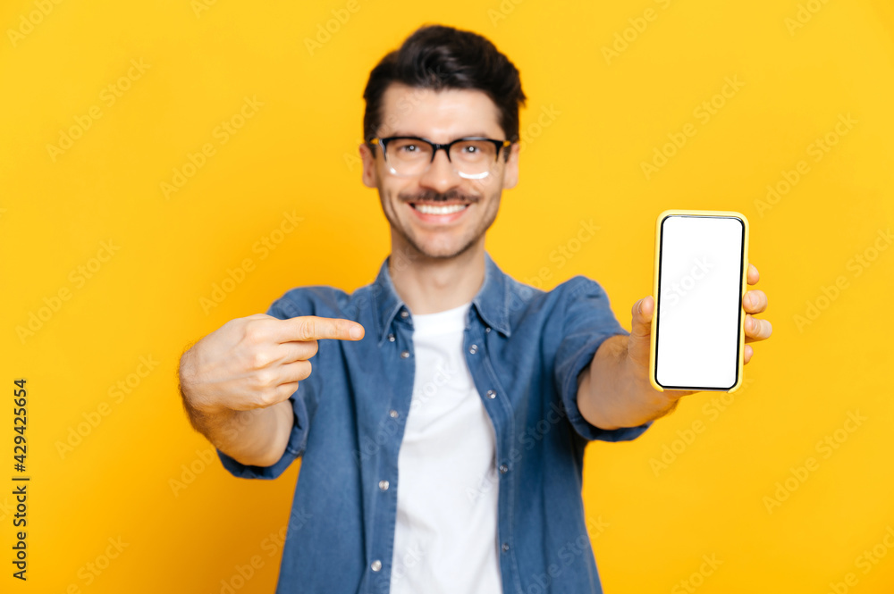 Defocused caucasian guy with glasses, looks at the camera, hold smartphone with white empty screen for your presentation in hand and points finger at it, stand on isolated orange background,copy space