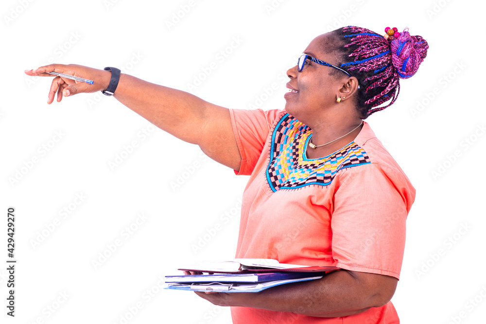 mature business woman with documents in hand pointing finger asi