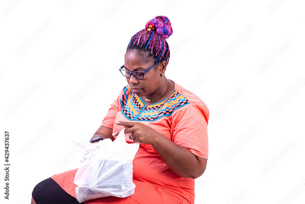 mature woman sitting on the floor looking in her sachet.