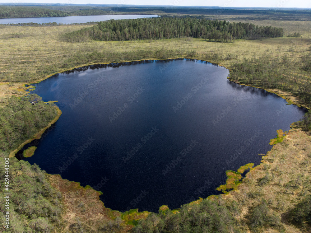 Round lake in the middle of a forest swamp, top view
