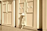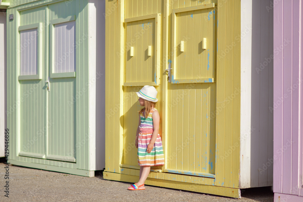 Girl in a colored dress near colorful wooden houses on the ocean Saint aubin sur mer
