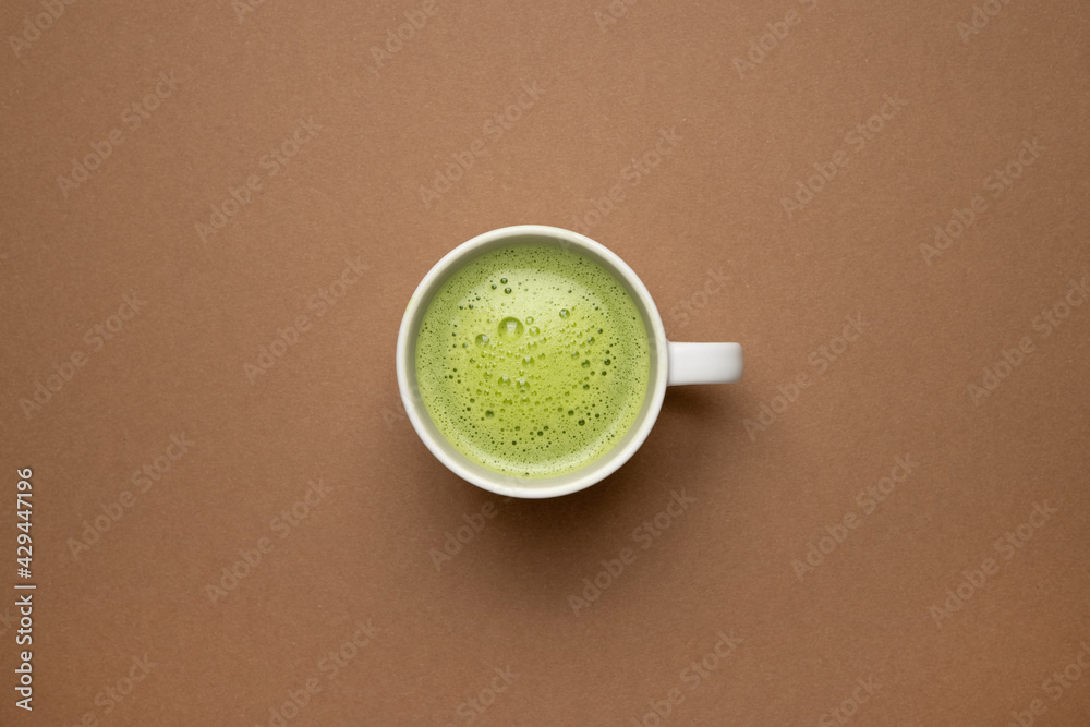 Hot green tea late with modern style and delicious on light brown background, matcha texture macro Trend color 2025 Mocha Mousse