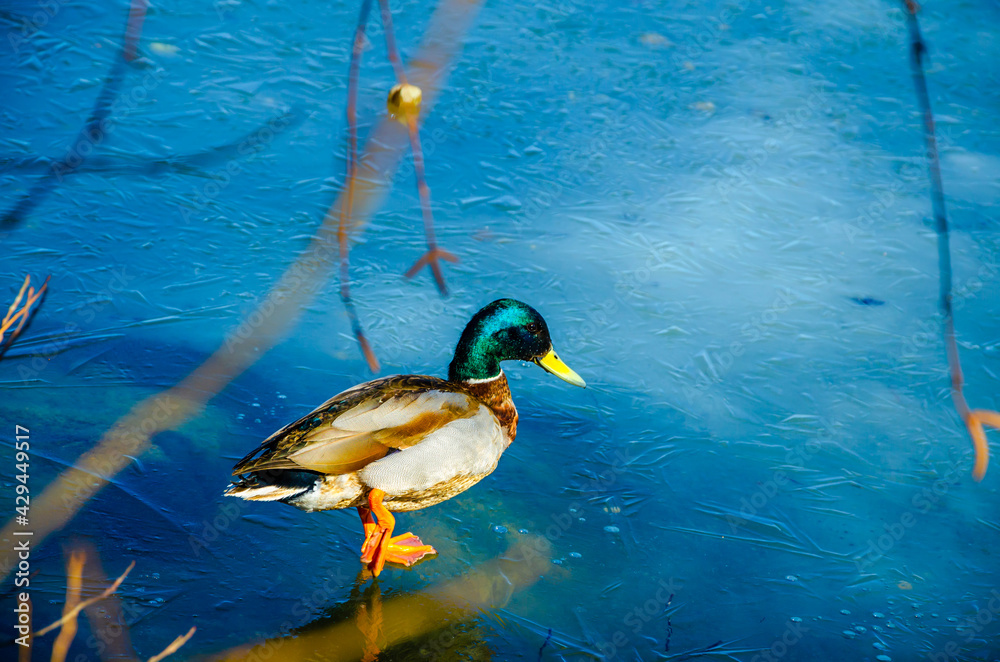 The duck is standing on thin spring ice.
