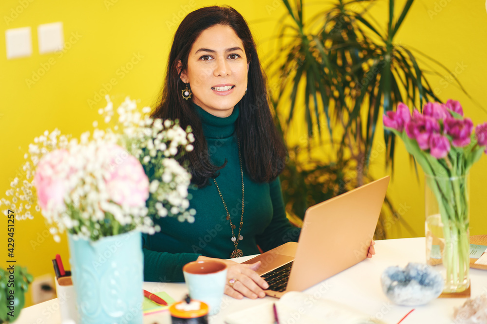 Beautiful middle age woman working in colorful cosy office, using portable laptop computer