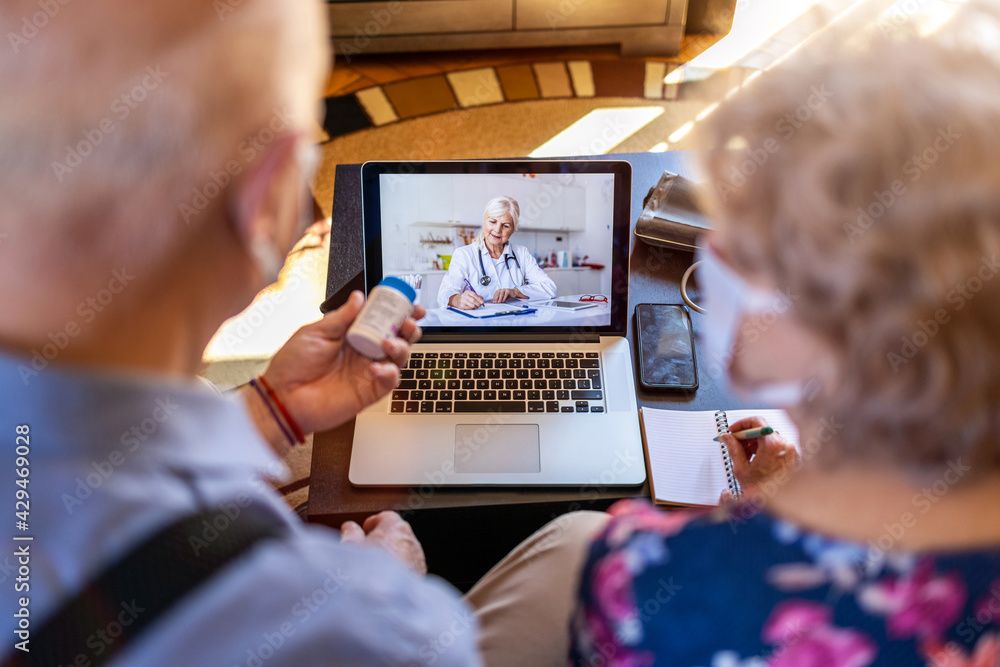 Senior couple consulting with a doctor on laptop at home