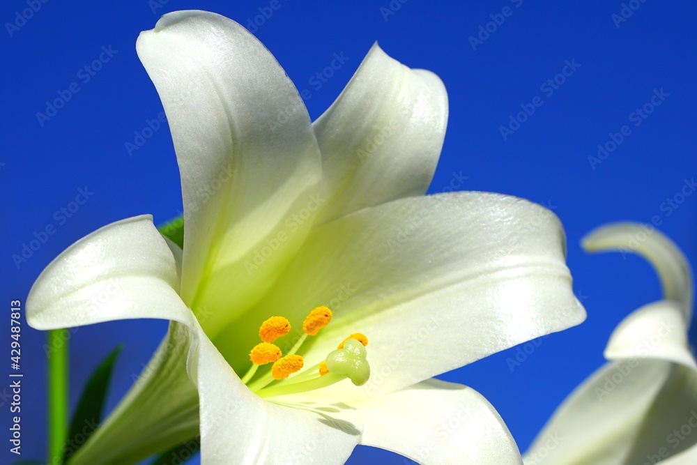 Fragrant white and yellow trumpet flowers of Easter Lily flowers (lilium longiflorum) in the spring