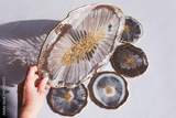 Cup holder, epoxy resin tray, marine-style stone cut on grey background. Brown and grey stains of paint, gold trim. Subject for table setting. Gloss, reflection. Epoxy resin coaster. Home decor