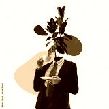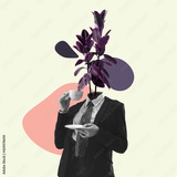 Contemporary art collage, modern design. Retro style. Human body drinking coffee in casual style outfit being headed by plant