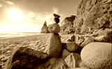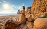 Portugal Ursa Beach at atlantic coast of Atlantic Ocean with rocks and sunset sun waves and foam at sand of coastline picturesque landscape panorama.