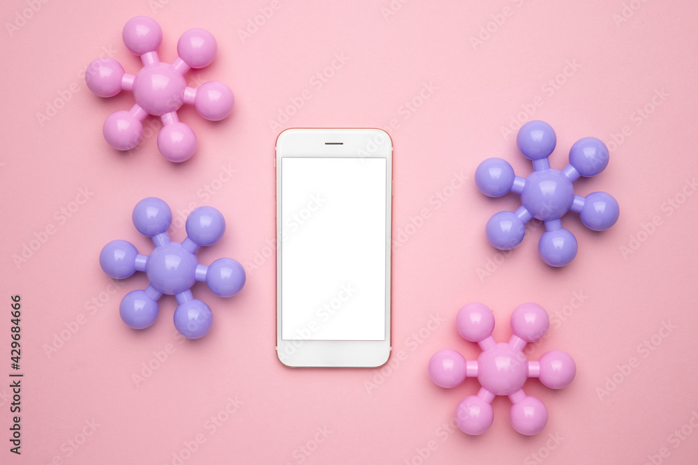 Baby kid toy purple molecula model constructor and mobile phone mock up on the pastel pink background